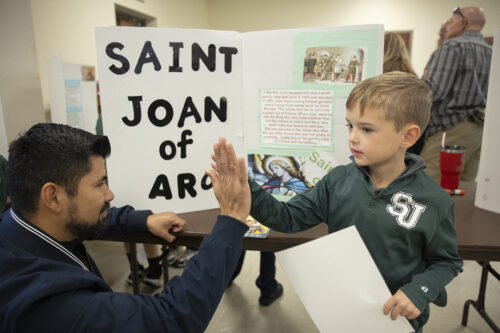 Father Gerson Parra, parochial administrator of St. Joseph Parish, made his way around the room, listening as students explained their projects and shared the lives of the saints. Father Parra’s favorite saint is the Blessed Mother, he said, but he also has devotions to St. Patrick, St. Jude and St. Ignatius of Loyola.