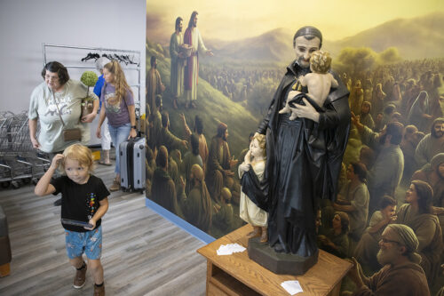 The first thing he bought for the new store was a statue of St. Vincent de Paul, which now sits on an oak pedestal in the center of the store foyer, the very first thing a customer sees when entering the building. Behind the statue is a wall-sized print of Jesus feeding the 5,000 with loaves and fishes.