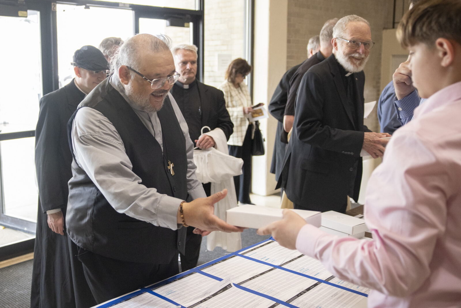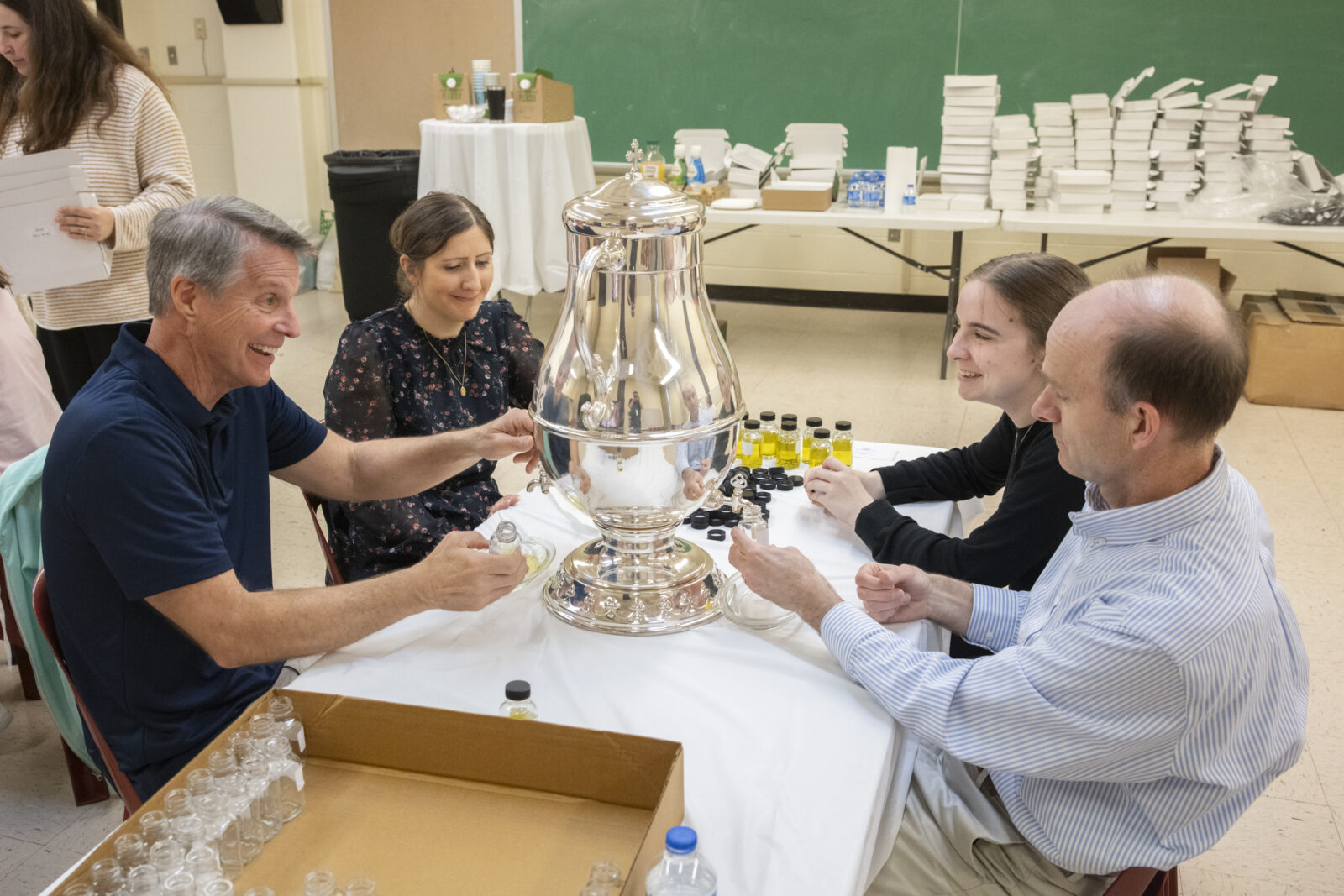 After the oils are blessed and the chrism is consecrated, volunteers divide them into small bottles to distribute to priests for their parishes and other ministries, such as hospitals or nursing homes.