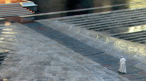 Like St. John Paul II before him, Pope Francis also displayed an instinctive understanding of the power of gestures. Two moments of prayer were among his most iconic images: Francis’ visit to Auschwitz in 2016, where he remained entirely silent to underline the futility of speech in the face of such evil; and his “urbi et orbi” blessing from an empty St. Peter’s Square in March 2020 during a global moment of fear and uncertainty at the start of the coronavirus pandemic. On that haunting night, Pope Francis became the world’s pastor, saying, “From this colonnade that embraces Rome and the whole world, may God’s blessing come down upon you as a consoling embrace.”