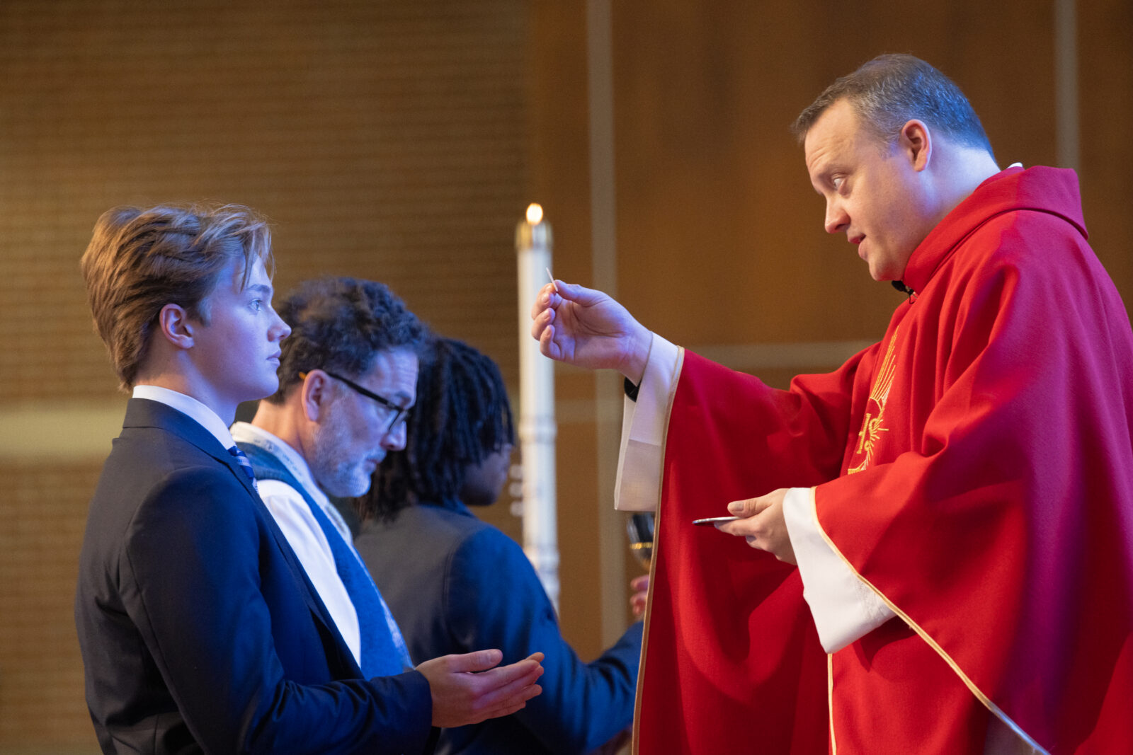 St. Louis University High School student Joseph Coovert received communion from Father Matt Stewart, SJ.