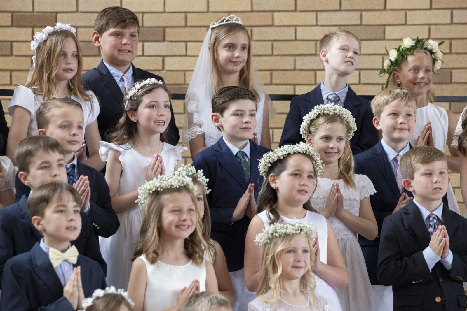 First Communicants took pictures before Mass where they received the Eucharist for the first time April 12 at St. Clement of Rome in Des Peres.