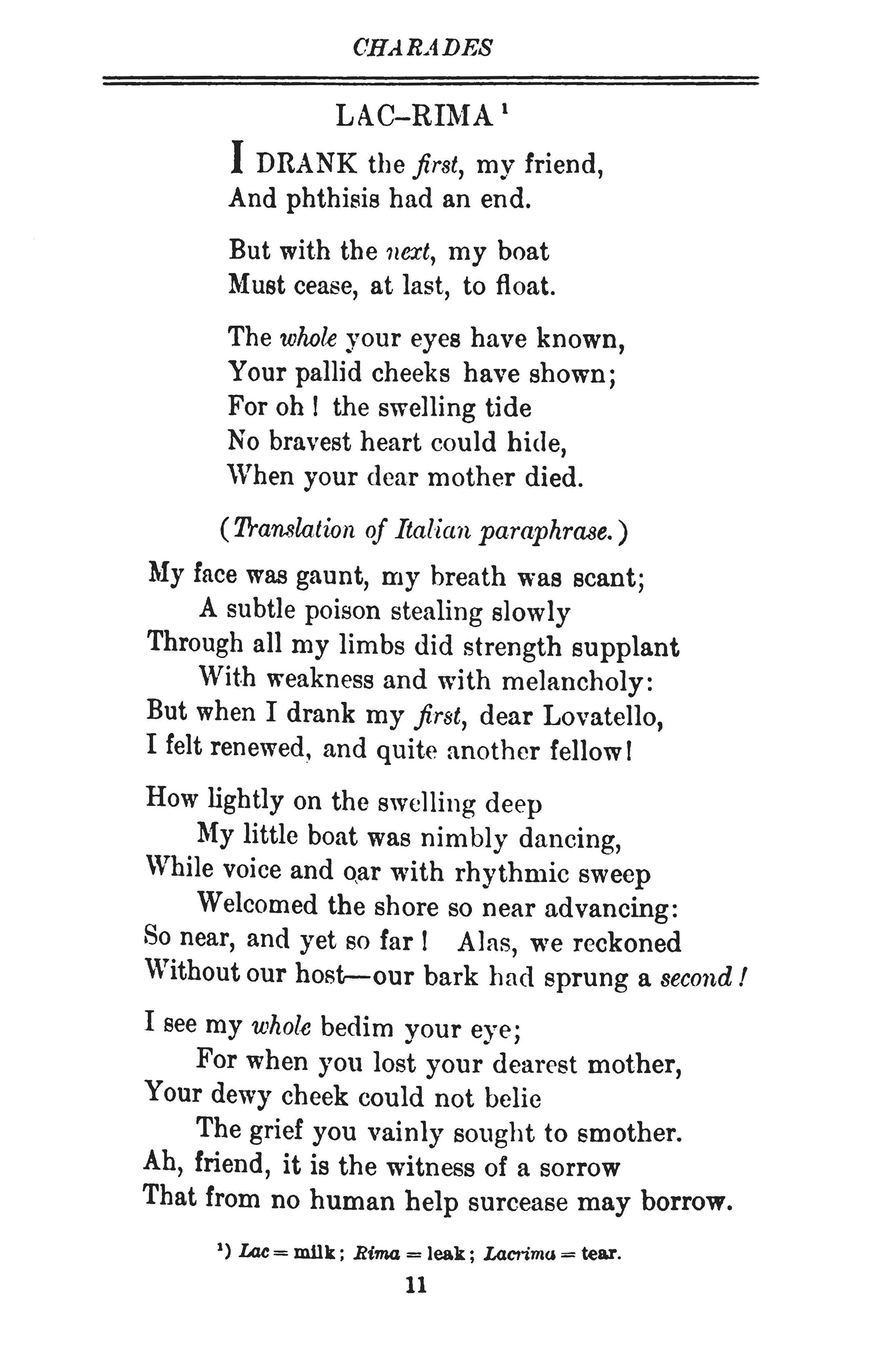 The answer, “lacrima,” (“teardrop”) merges clues elsewhere in the poem for “lac” (“milk”) and “rima” (“leak” or “fissure”).
