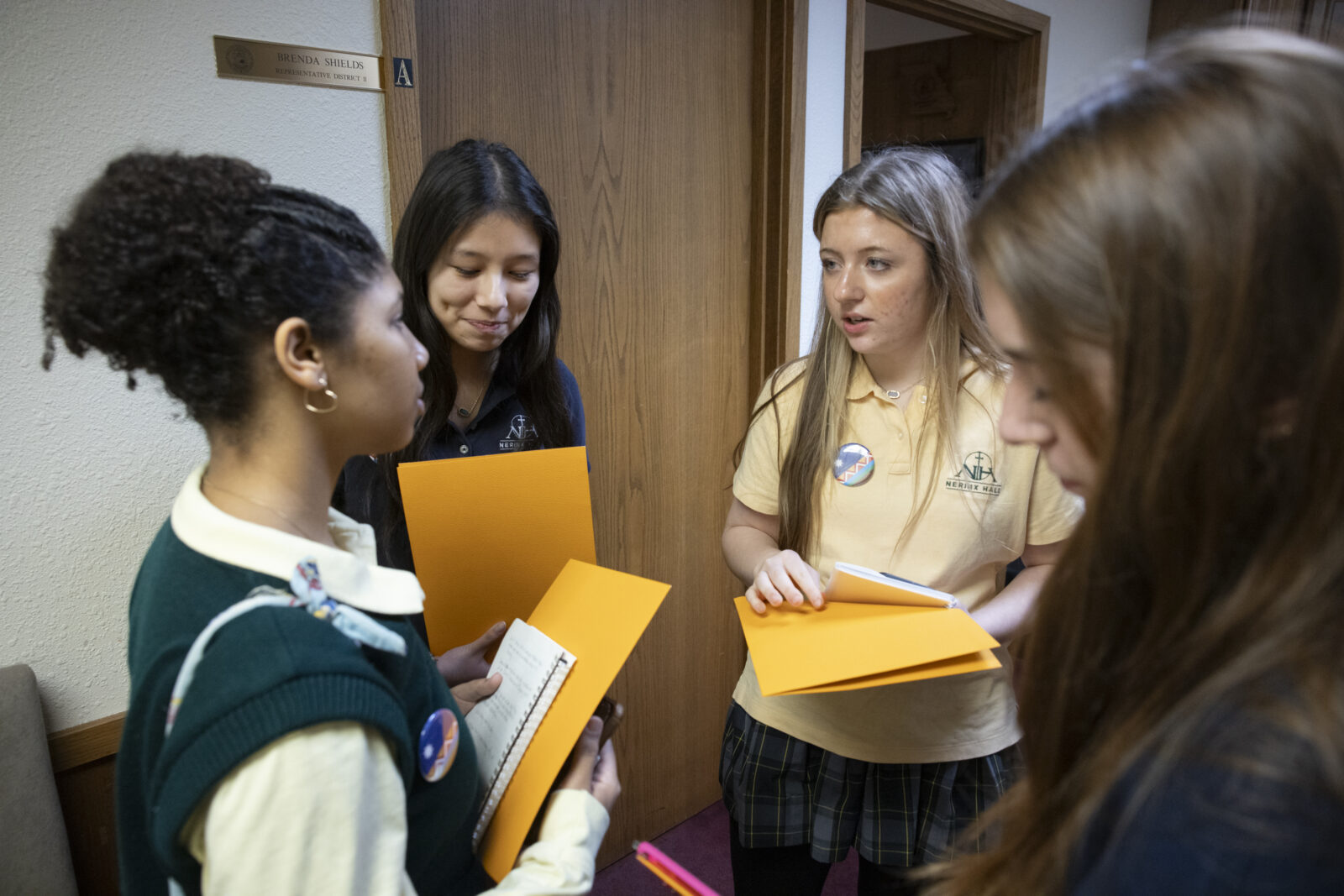 JEFFERSON CITY — Four Catholic high school students, easily identifiable in their plaid skirts, strode confidently through the Missouri State Capitol hallways. They were ready to take their civics and theology lessons out of the classroom and into legislators’ offices.