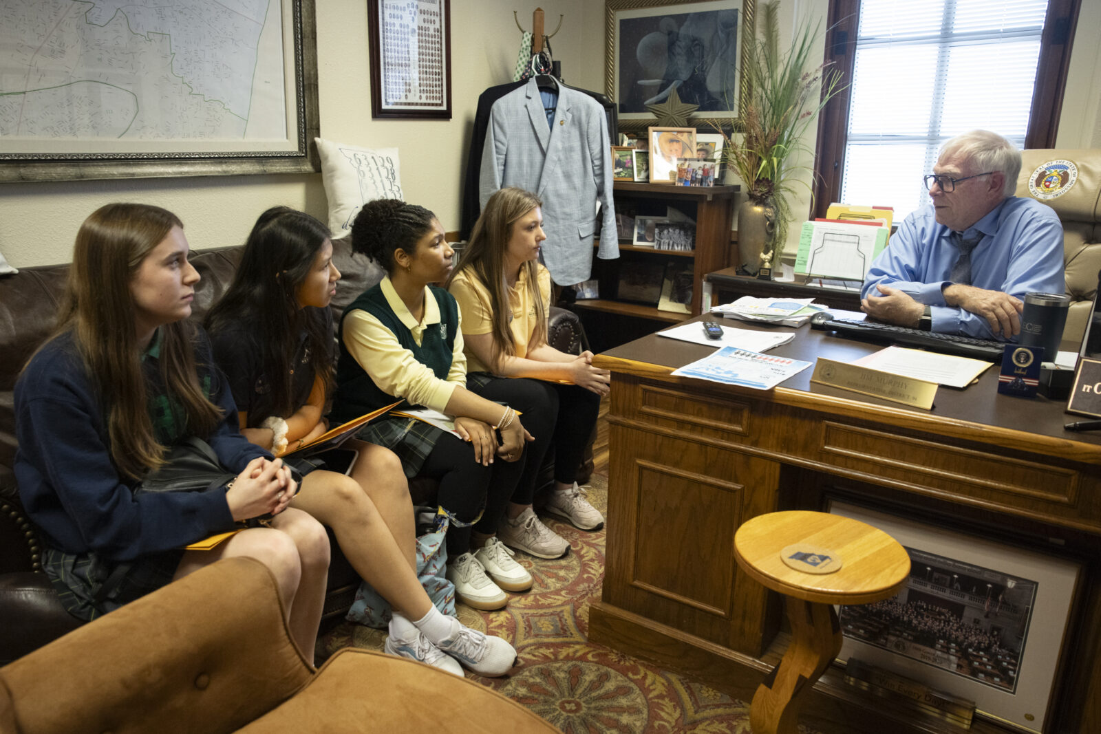 Harper Searcy, Lilly Buster and Gabriela Mendoza, all juniors at Nerinx Hall, and Sydney Moore, a senior at St. Joseph’s Academy, were part of a group from the Archdiocese of St. Louis participating in Hispanic Capitol Day on Feb. 17.